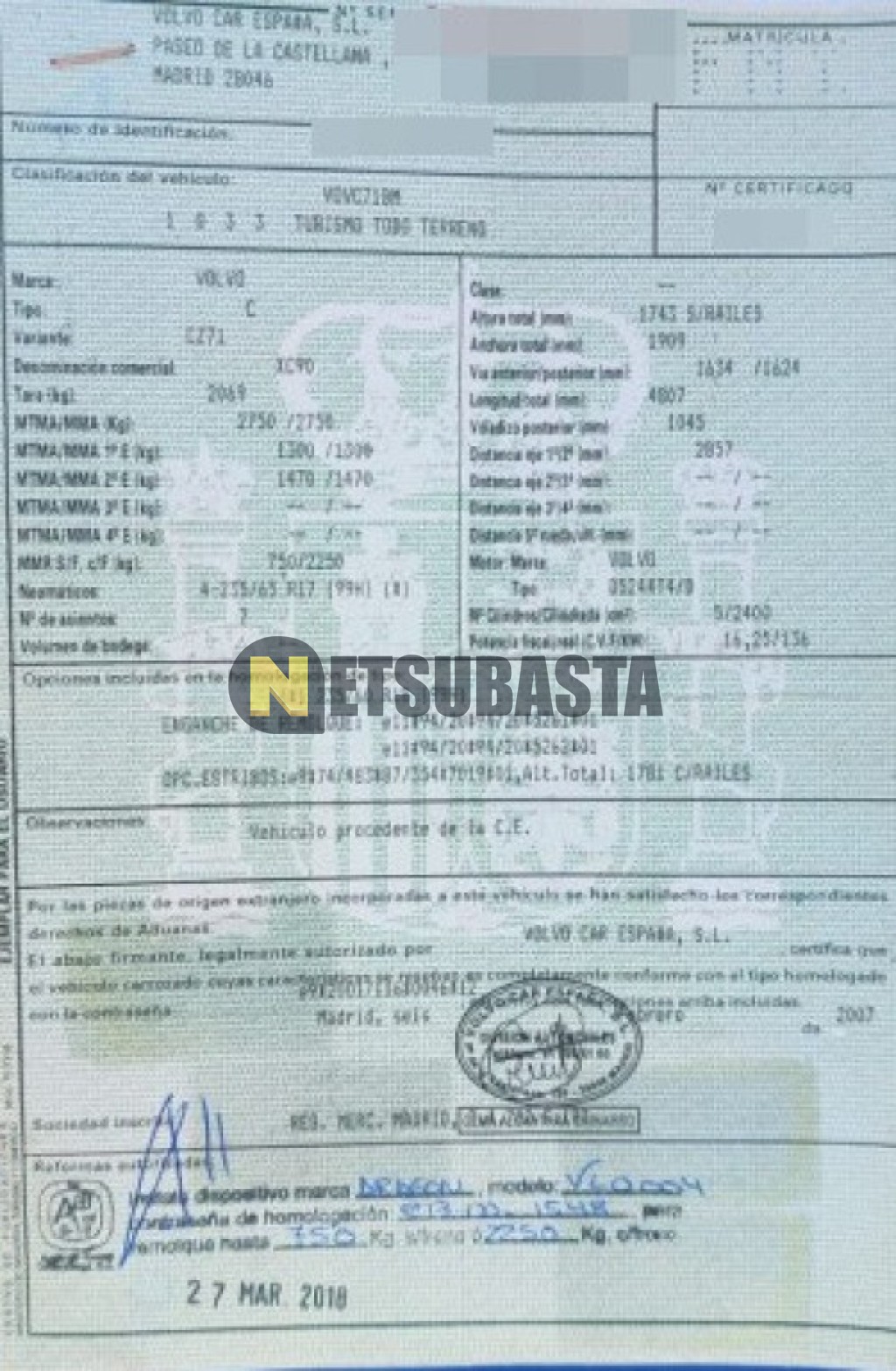 Subasta de Volvo XC90 D5 Aut. 2007 Averiados, Marca Volvo, Modelo XC90 D5 Aut., Combustible Diésel, Kilometraje 305.000 KM, Fecha 1ª matriculación 04/2007, Matrícula ****FNY, Color Exterior , Color Interior , IVA REBU y Ubicación Barcelona.