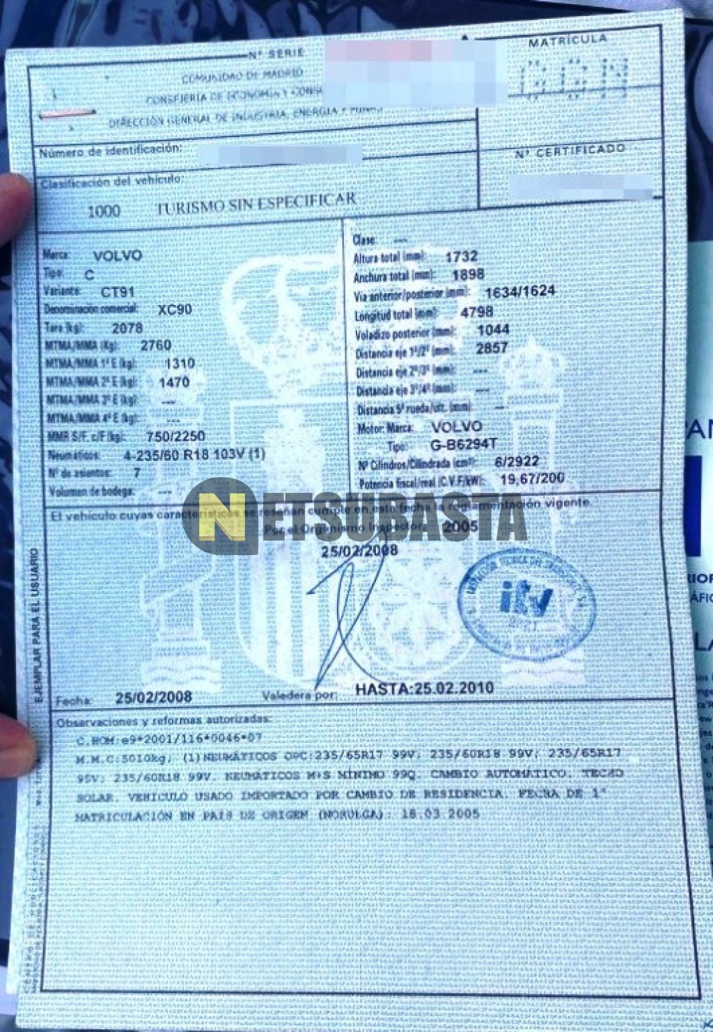 Subasta de Volvo XC90 T6 2005 Averiados, Marca Volvo, Modelo XC90 T6, Combustible Gasolina, Kilometraje 245.000 KM, Fecha 1ª matriculación 03/2005, Matrícula ****GGN, Color Exterior , Color Interior , IVA REBU y Ubicación Madrid.