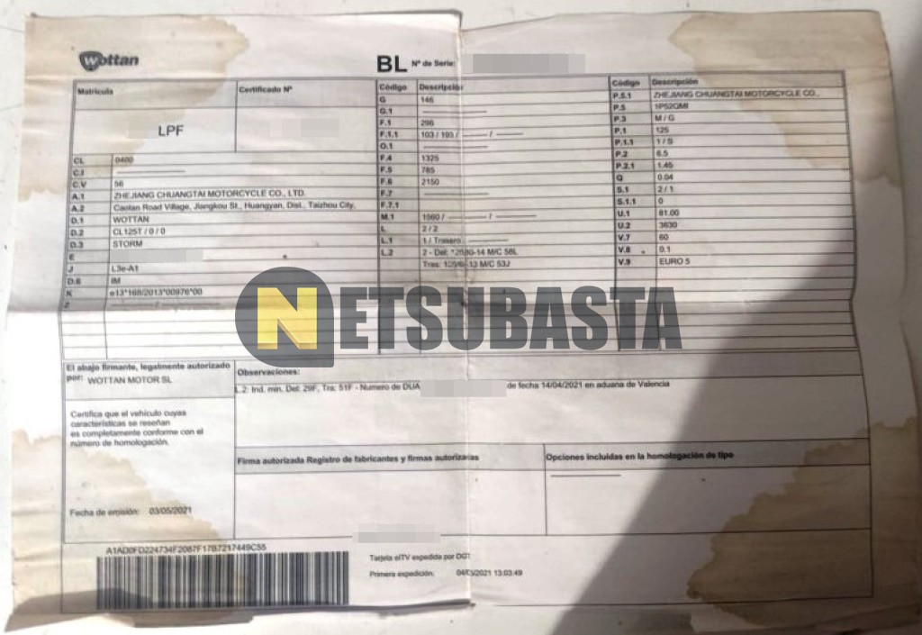 Subasta de Wottan Storm 125 2021 Averiados, Marca Wottan, Modelo Storm 125 , Combustible Gasolina, Kilometraje 42.000 KM, Fecha 1ª matriculación 05/2021, Matrícula ****LPF, Color Exterior , Color Interior , IVA REBU y Ubicación Sevilla.