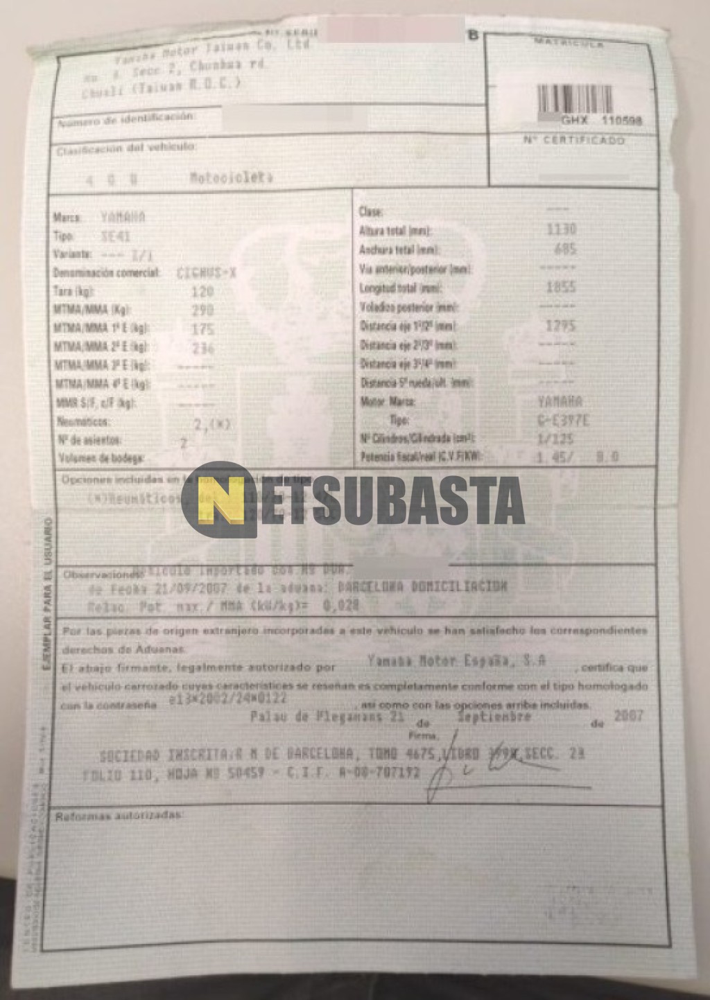 Subasta de Yamaha Cygnus 125 X 2008 Averiados, Marca Yamaha, Modelo Cygnus 125 X, Combustible Gasolina, Kilometraje 45.000 KM, Fecha 1ª matriculación 10/2008, Matrícula ****GHX, Color Exterior , Color Interior , IVA REBU y Ubicación Madrid.