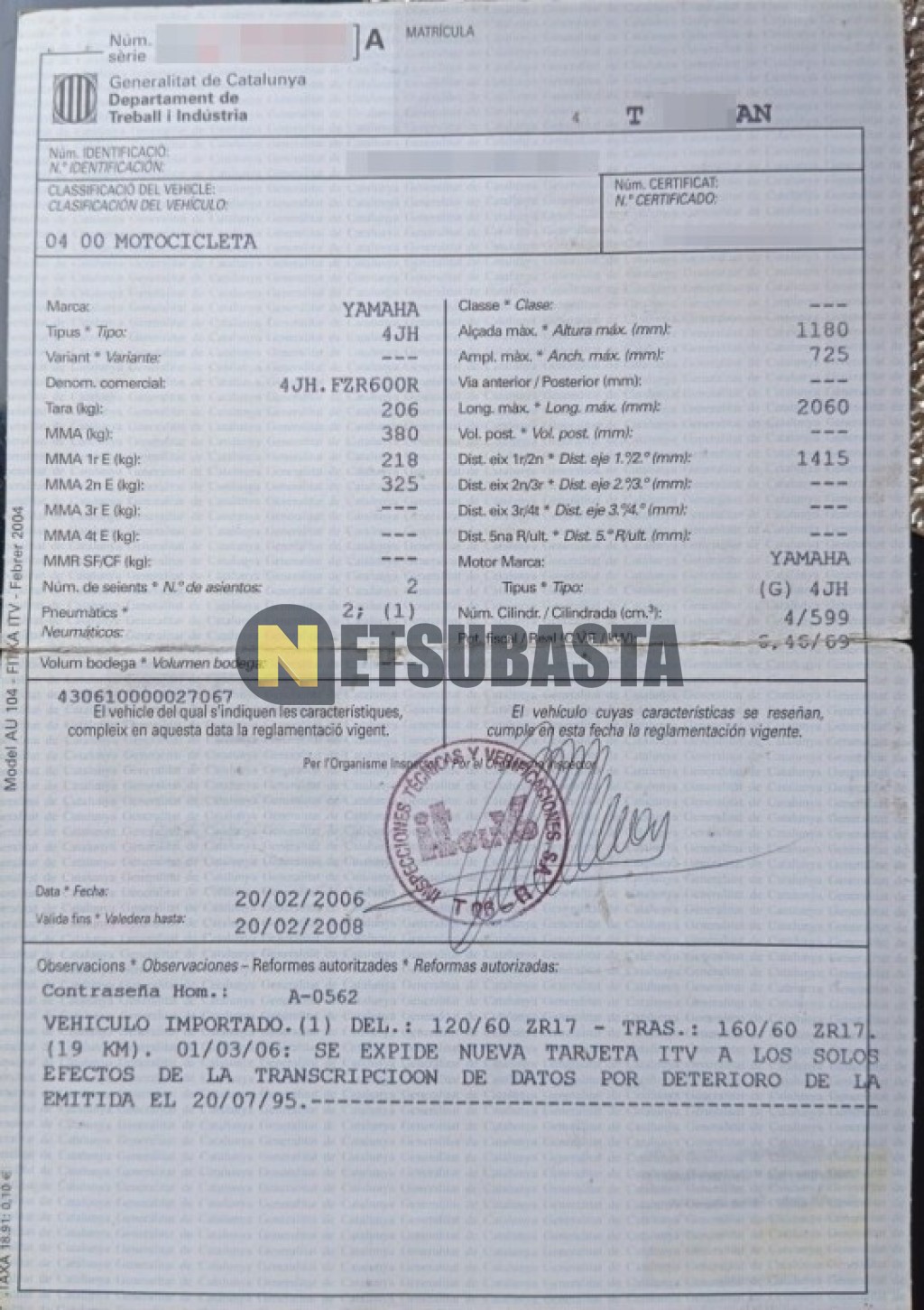 Subasta de Yamaha FZR 600 Genesis 1995 Averiados, Marca Yamaha, Modelo FZR 600 Genesis, Combustible Gasolina, Kilometraje 55.000 KM, Fecha 1ª matriculación 08/1995, Matrícula T****AN, Color Exterior , Color Interior , IVA REBU y Ubicación Castellón.