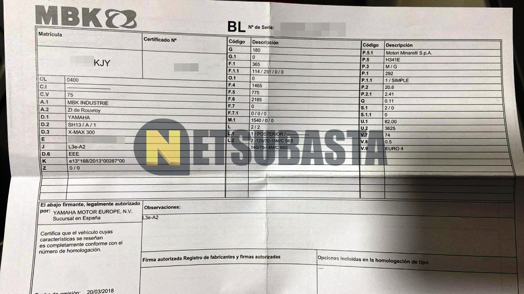 Subasta de Yamaha XMAX 300 2018 Averiados, Marca Yamaha, Modelo XMAX 300, Combustible Gasolina, Kilometraje 40.000 KM, Fecha 1ª matriculación 04/2018, Matrícula ****KJY, Color Exterior , Color Interior , IVA REBU y Ubicación Madrid.