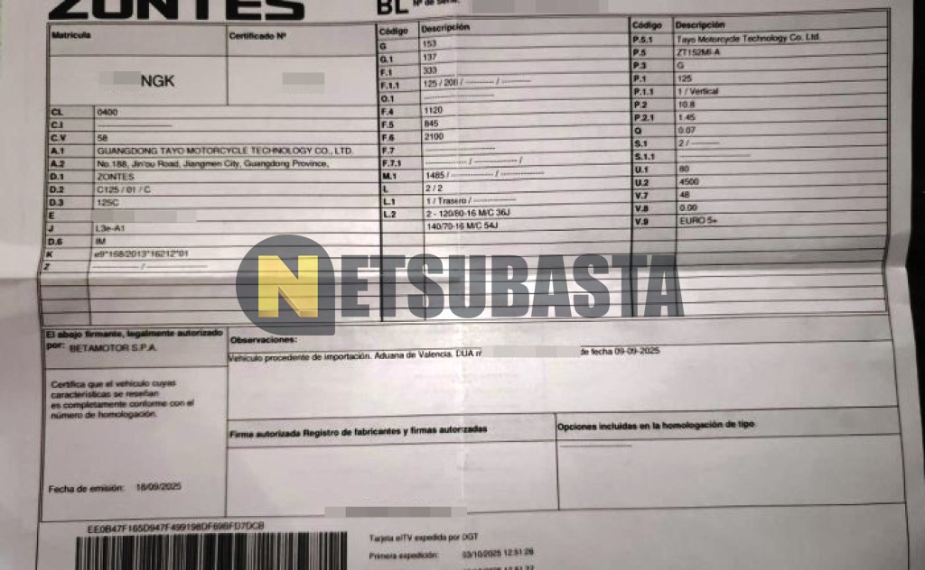 Subasta de ZONTES 125 C 2025 Siniestrados, Marca ZONTES, Modelo 125 C, Combustible Gasolina, Kilometraje 1.000 KM, Fecha 1ª matriculación 10/2025, Matrícula ****NGK, Color Exterior , Color Interior , IVA REBU y Ubicación Murcia.