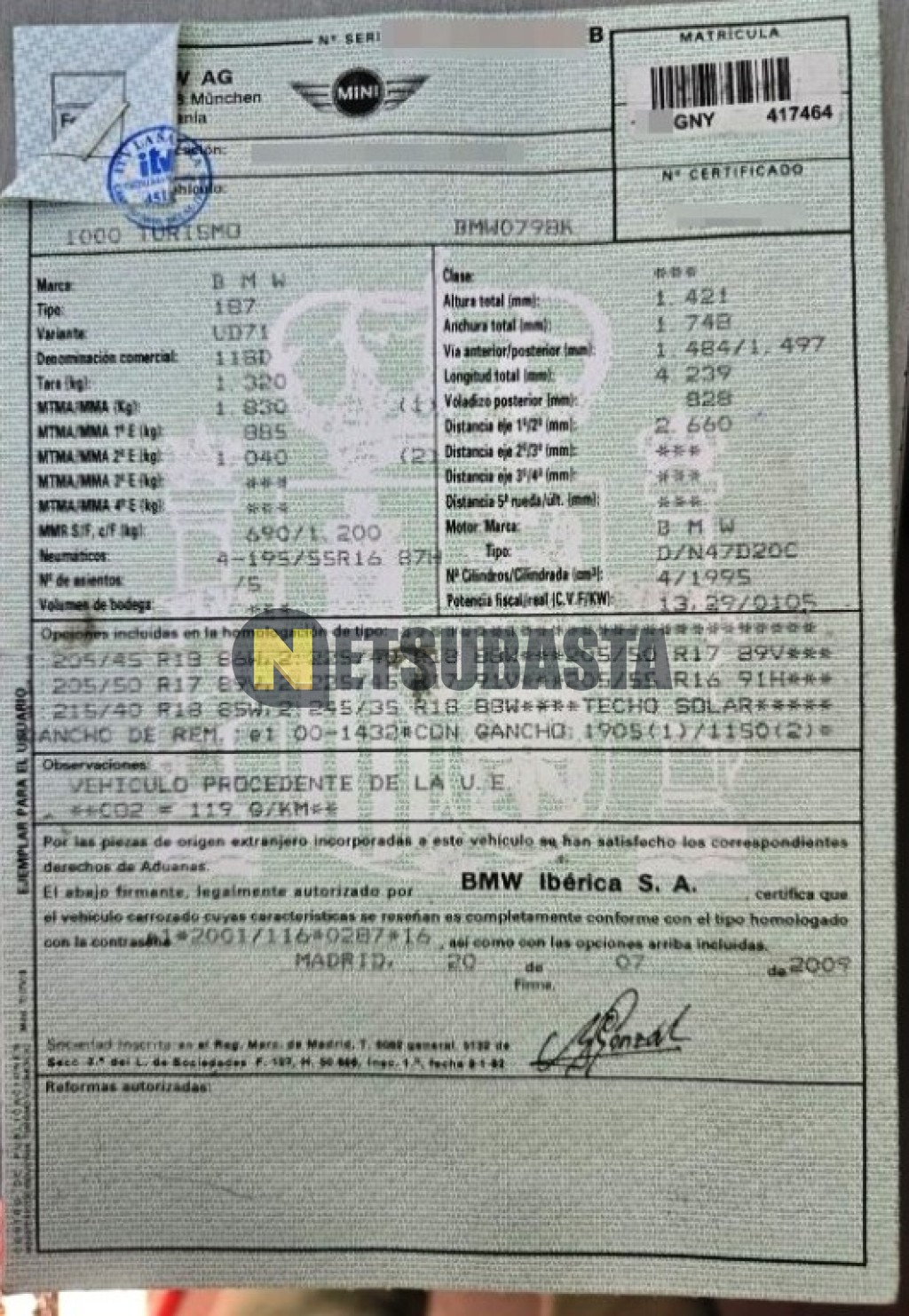 Subasta de Bmw 118d 2009 Siniestrados, Marca Bmw, Modelo 118d, Combustible Diésel, Kilometraje 262.000 KM, Fecha 1ª matriculación 07/2009, Matrícula ****GNY, Color Exterior , Color Interior , IVA REBU y Ubicación Madrid.
