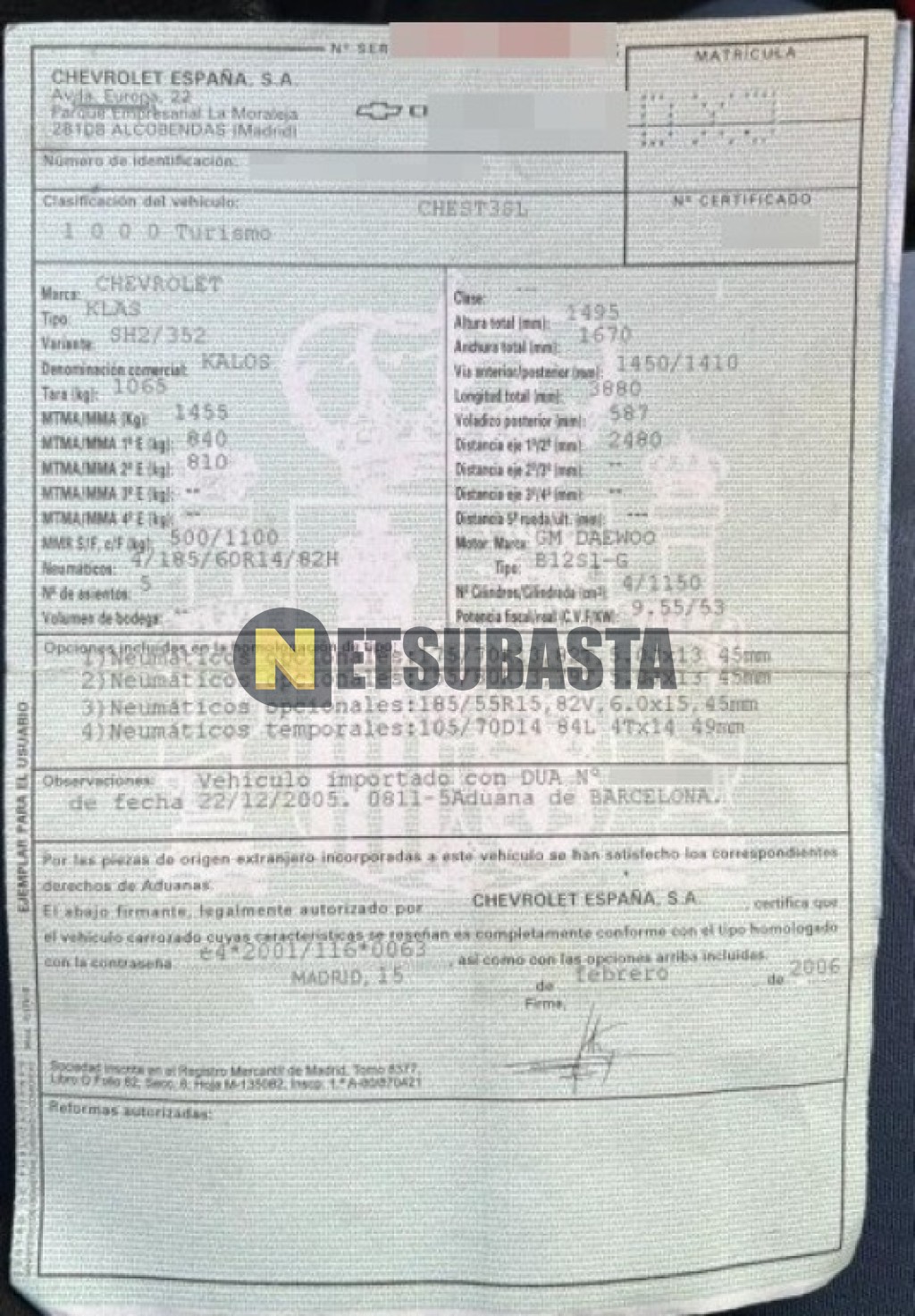 Subasta de Chevrolet Kalos 1.2 2006 Averiados, Marca Chevrolet, Modelo Kalos 1.2, Combustible Gasolina, Kilometraje 185.000 KM, Fecha 1ª matriculación 03/2006, Matrícula ****DXJ, Color Exterior , Color Interior , IVA REBU y Ubicación Barcelona.