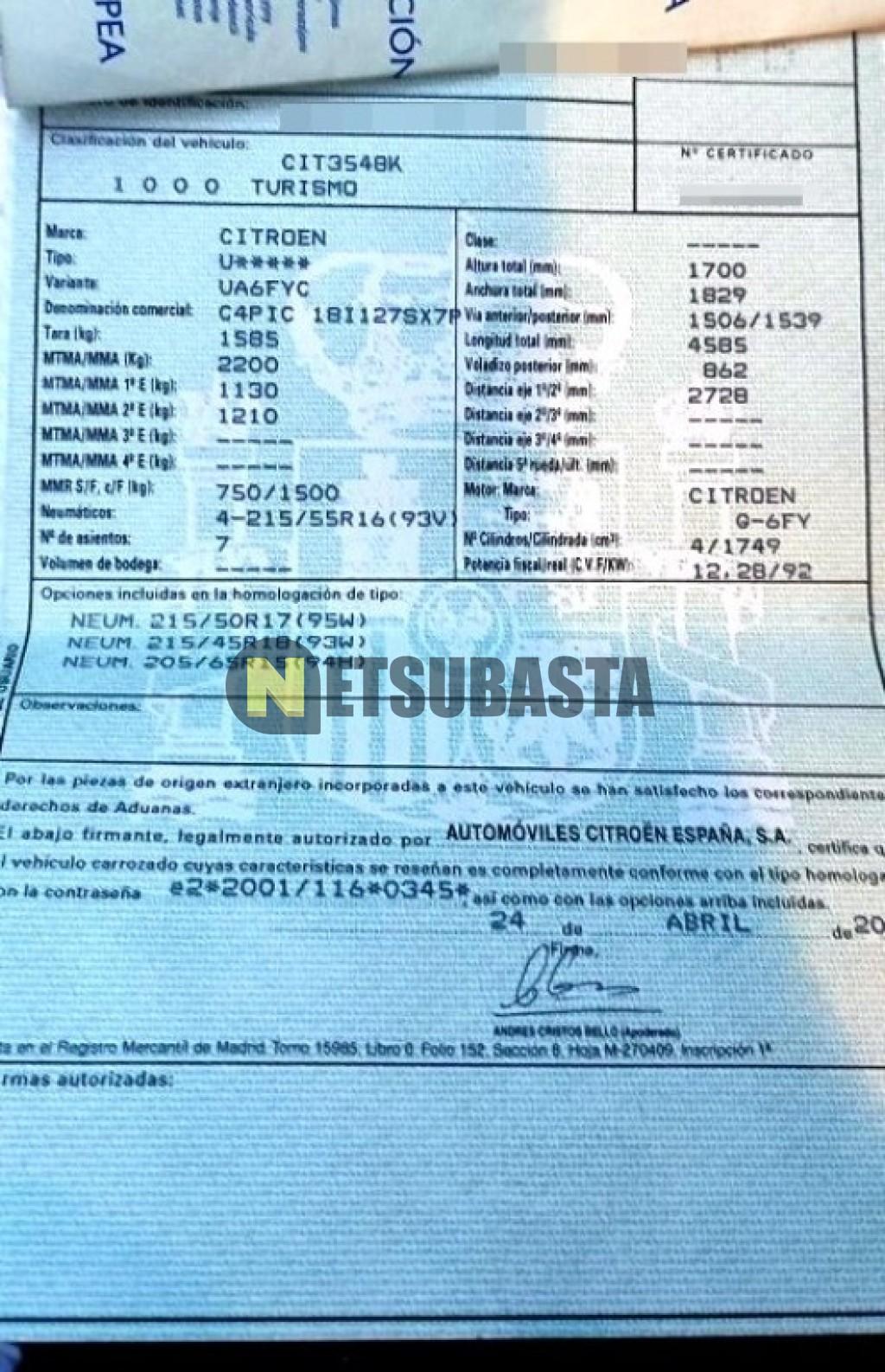 Subasta de Citroën Grand C4 Picasso 1.8i 16v 2007 Siniestrados, Marca Citroën, Modelo Grand C4 Picasso 1.8i 16v , Combustible Gasolina, Kilometraje 165.000 KM, Fecha 1ª matriculación 05/2007, Matrícula ****FPB, Color Exterior , Color Interior , IVA REBU y Ubicación Álava.