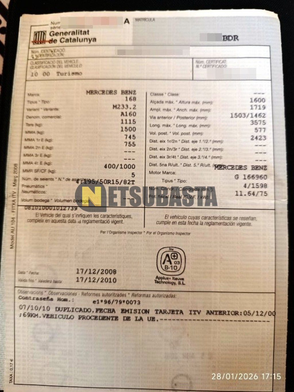 Subasta de Mercedes-Benz A 160 2001 Averiados, Marca Mercedes-Benz, Modelo A 160, Combustible Gasolina, Kilometraje 135.000 KM, Fecha 1ª matriculación 01/2001, Matrícula ****BDR, Color Exterior , Color Interior , IVA REBU y Ubicación Tarragona.