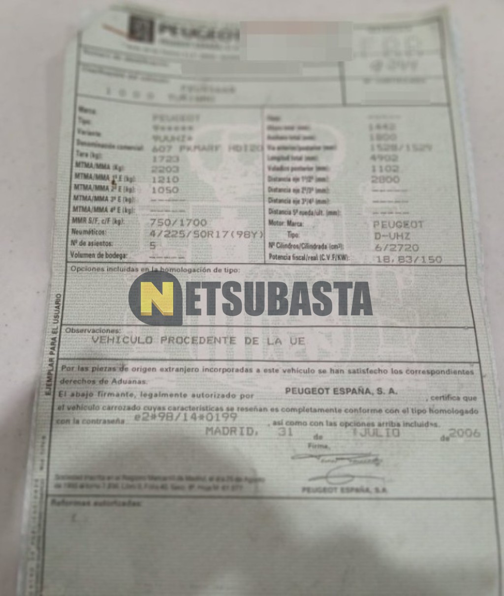 Subasta de Peugeot 607 2.7 HDi Aut. 2007 Averiados, Marca Peugeot, Modelo 607 2.7 HDi Aut., Combustible Diésel, Kilometraje 320.000 KM, Fecha 1ª matriculación 06/2007, Matrícula ****FRR, Color Exterior , Color Interior , IVA REBU y Ubicación Madrid.